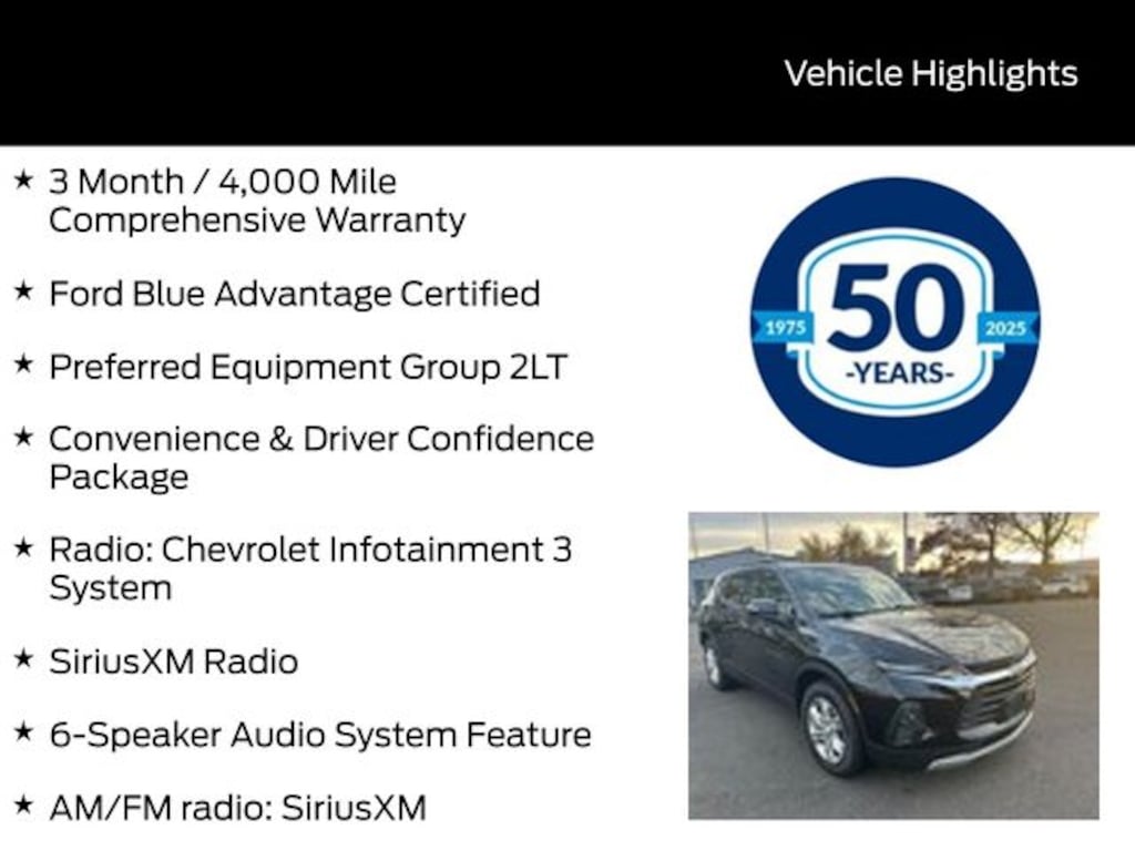 Recent Arrival! 2022 Chevrolet Blazer LT 2.0L Turbocharged 9-Speed Automatic with Overdrive AWD 4D Sport Utility Black 3 Month / 4,000 Mile Comprehensive Warranty, Ford Blue Advantage Certified, 6-Speaker Audio System Feature, AM/FM radio: SiriusXM, Apple CarPlay/Android Auto, Automatic temperature control, Black Roof Rails, Convenience & Driver Confidence Package, Exterior Parking Camera Rear, Front Bucket Seats, Front Center Armrest, Front dual zone A/C, Heated Driver & Front Passenger Seats, Inside Rear-View Auto-Dimming Mirror, Lane Change Alert w/Side Blind Zone Alert, Outside Heated Power-Adjustable Body-Color Mirrors, Power driver seat, Power windows, Preferred Equipment Group 2LT, Radio: Chevrolet Infotainment 3 System, Rear Cross Traffic Alert, Rear Park Assist w/Audible Warning, Rear Power Programmable Liftgate, Rear window defroster, Rear window wiper, Remote keyless entry, Remote Start, SiriusXM Radio, Speed control, Tilt steering wheel, Universal Home Remote, Wheels: 18" Bright Silver Aluminum. 22/27 City/Highway MPG