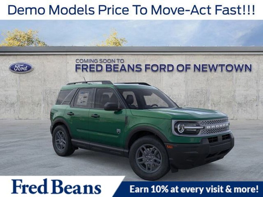 2025 Ford Bronco Sport Big Bend SLIN Big Bend SLIN 1.5L EcoBoost 4WD Green Metallic Price includes: $2500 - Retail Customer Cash $500 - Bonus Cash DISCLAIMER: Up to $500 dealer discount applied to MSRP or Fred Beans Price. Sales Price already reflects offer. Not cash back. See dealer.