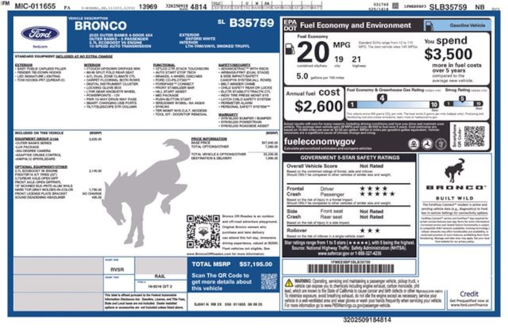 2025 Ford Bronco Outer Banks Outer Banks 2.7L EcoBoost V6 4WD Oxford White Price includes: $1500 - Bonus Customer Cash