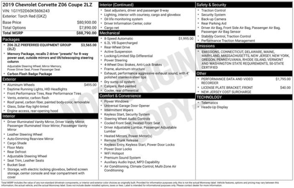 2019 Chevrolet Corvette Z06 2LZ V8 8 Speed Paddle Shift with Automatic Modes RWD 2D Coupe Torch Red Local Trade, 8-Way Driver & Passenger Seat Adjusters, Adaptive suspension, Alloy wheels, Auto-Dimming Inside Frameless Rearview Mirror, Automatic temperature control, Body-Color Outside Heated Power-Adjustable Mirrors, Bose Advanced 10-Speaker Audio System Feature, Cargo Net, Chrome Badge Package, Exterior Parking Camera Rear, Front Curb View Cameras, Head-Up Display, Heated & Vented Driver & Front Passenger Seats, Luggage Shade, Memory Package, Power door mirrors, Power driver seat, Power Lumbar/Bolster Seat Adjusters, Power windows, Preferred Equipment Group 2LZ, Rear window defroster, Remote keyless entry, SiriusXM Radio, Spoiler, Theft Deterrent System, Universal Home Remote.