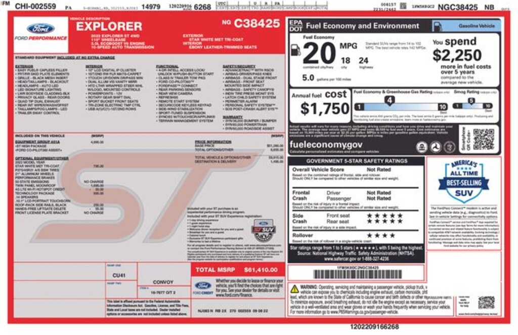 2022 Ford Explorer ST 3.0L EcoBoost V6 10-Speed Automatic 4WD 4D Sport Utility Star White Metallic Tri-Coat