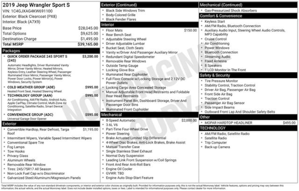 Whether you're conquering the trails or navigating the city streets, this 2019 Jeep Wrangler Sport S is ready to take you there in style and comfort. Experience the perfect blend of capability, technology, and convenience that only a Wrangler can provide.